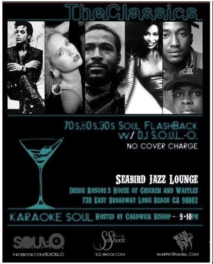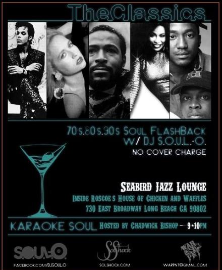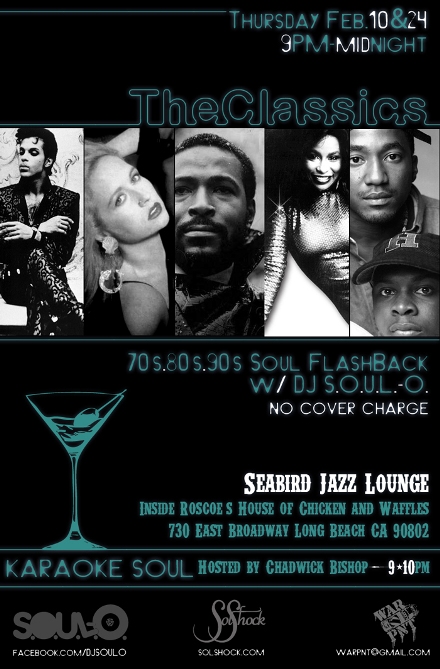Posted on: 2011/02/01, by : SolShock MediaOn Thursday February 10 & 24, we will “Tear the Roof off the Sucka” like Parliament Funk when we take over Seabird Jazz Lounge for a premier night of classic soul, funk and hip hop with “The Classics”. Join SolShock, Producer/DJ S.O.U.L.-O. and singer-songwriter/musician Chadwick Bishop for live karaoke from 9pm-10pm followed by a soulful flashback party until midnight. Expect soulful hits from the 70’s and up PLUS full bar and no cover charge. Dress code enforced: No tennis shoes or plain white T’s (Club rules). 21 & over.